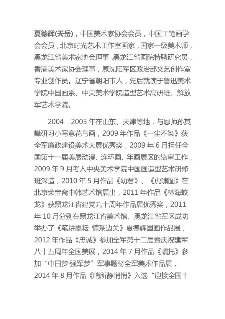 夏德辉(天岳),中国美术家协会会员,中国工笔画学会会员,北京时光艺术工作室画家,国家一级美术师,黑龙江省美术家协会理事,黑龙江省画院特聘研究员,香港美术家协会理事,原沈阳军区政治部文艺创作室专业创作员。辽宁省朝阳市人,先后就读于鲁迅美术学院中国画系、中央美术学院造型艺术高研班、解放军艺术学院。