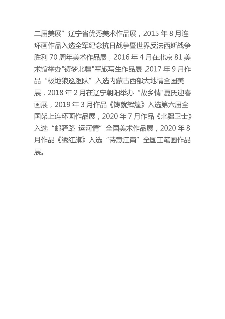 2004—2005年在山东、天津等地,与恩师孙其峰研习小写意花鸟画,2009年作品《一尘不染》获全军廉政建设美术大展优秀奖,2009年6月担任全国第十一届美展动漫、连环画、年画展区的监审工作,2009年9月考入中央美术学院中国画造型艺术研修班深造,2010年5月作品《幼君》、《虎啸图》在北京荣宝斋中韩艺术馆展出,2011年作品《林海蛟龙》获黑龙江省建党九十周年作品展优秀奖,2011年10月分别在黑龙江省美术馆、黑龙江省军区成功举办了《笔耕墨耘 情系边关》夏德辉国画作品展,2012年作品《忠诚》参加全军第十二届暨庆祝建军八十五周年全国美展,2014年7月作品《嘱托》参加“中国梦·强军梦”军事题材全军美术作品展,2014年8月作品《哨所静悄悄》入选“迎接全国十二届美展”辽宁省优秀美术作品展,2015年8月连环画作品入选全军纪念抗日战争暨世界反法西斯战争胜利70周年美术作品展,2016年4月在北京81美术馆举办"铸梦北疆"军旅写生作品展,2017年9月作品“极地狼巡逻队”入选内蒙古西部大地情全国美展,2018年2月在辽宁朝阳举办“故乡情"夏氏迎春画展,2019年3月作品《铸就辉煌》入选第六届全国架上连环画作品展,2020年7月作品《北疆卫士》入选“邮驿路 运河情”全国美术作品展,2020年8月作品《绣红旗》入选“诗意江南”全国工笔画作品展。